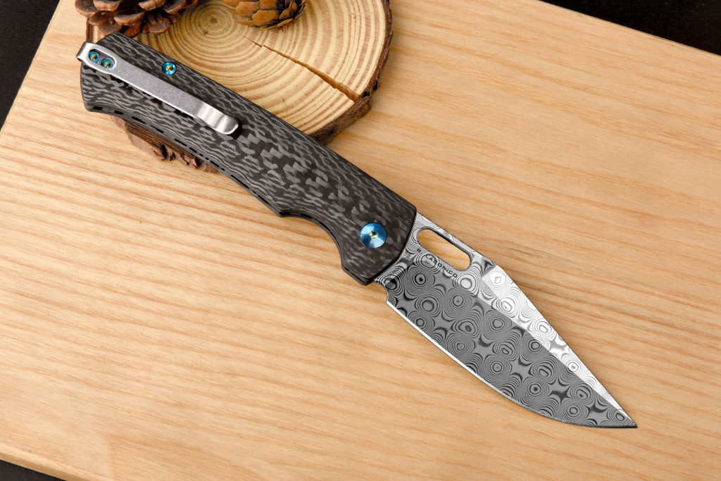 Táto špeciálna edícia REVEL má čepeľ z nápadne krásnej ružovej damaskovej ocele a rukoväť z jemne textúrovaného uhlíkového vlákna. Zvláštny akcent dodávajú modro potiahnuté skrutky, ktoré dokonale ladia s uhlíkovými vláknami. Na rozdiel od štandardnej verzie je gombíková poistka v decentnej čiernej farbe.