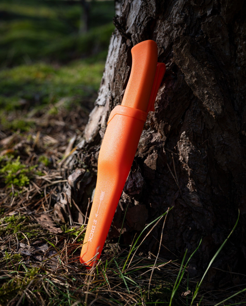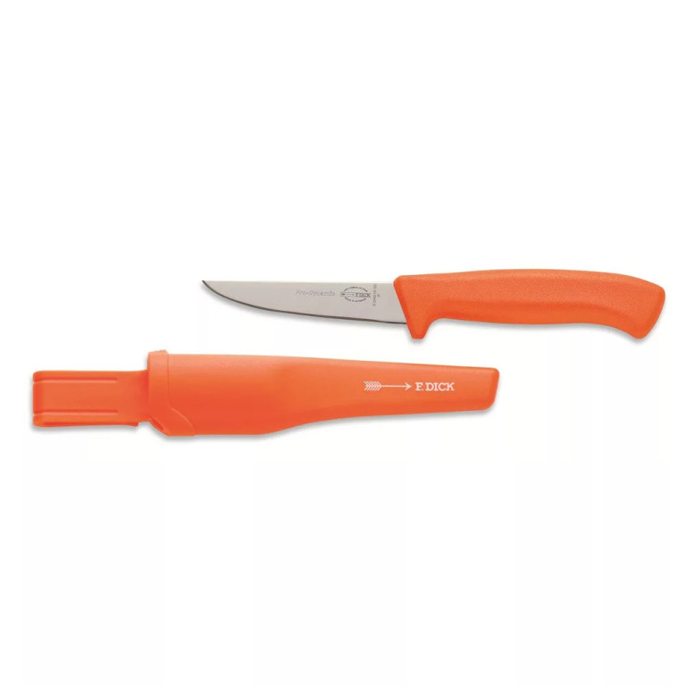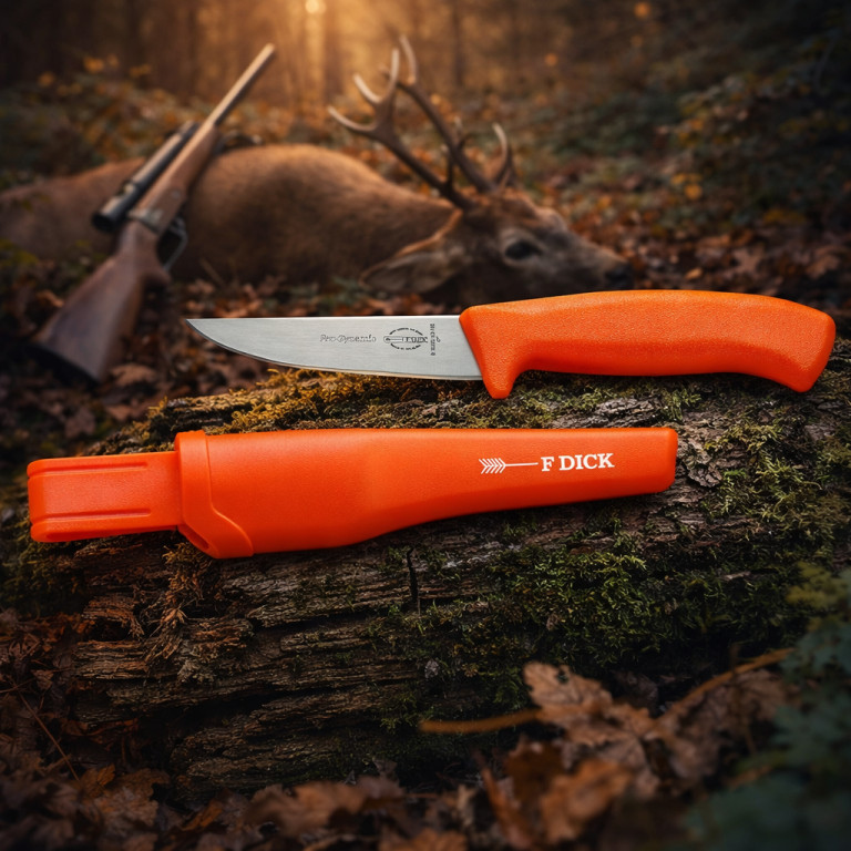Lovecký nôž ProDynamic s dĺžkou čepele 10 cm a plastovým puzdrom. Ľahký a praktický univerzálny nôž vrátane puzdra je určený na všetky práce v exteriéri. Plastové puzdro je vyrobené z odolného materiálu, ktorý je umývateľný a vhodný do umývačky riadu. Nôž je v puzdre vždy po ruke a bezpečne uložený, takže ho môžete bez obáv nosiť so sebou. Plastová rukoväť a kvalitná čepeľ vytvárajú moderný nôž s čistým, ľahkým dizajnom. Tvar rukoväti je ergonomický, mäkký plast je príjemný, ľahký a bezpečný v ruke. Bezchybná hygiena, pretože na výstupe čepele nie je žiadna medzera. Okrem toho široká ochrana prstov zaručuje väčšiu bezpečnosť pri práci. Čepeľ z X55CrMo14, dĺžka čepele: 10 cm, oranžová rukoväť z nešmykľavého plastu. Vyvážená tvrdosť 56 HRC je ideálnym kompromisom pre perfektnú ostrosť a ľahké brúsenie. Vyrobené v Nemecku.